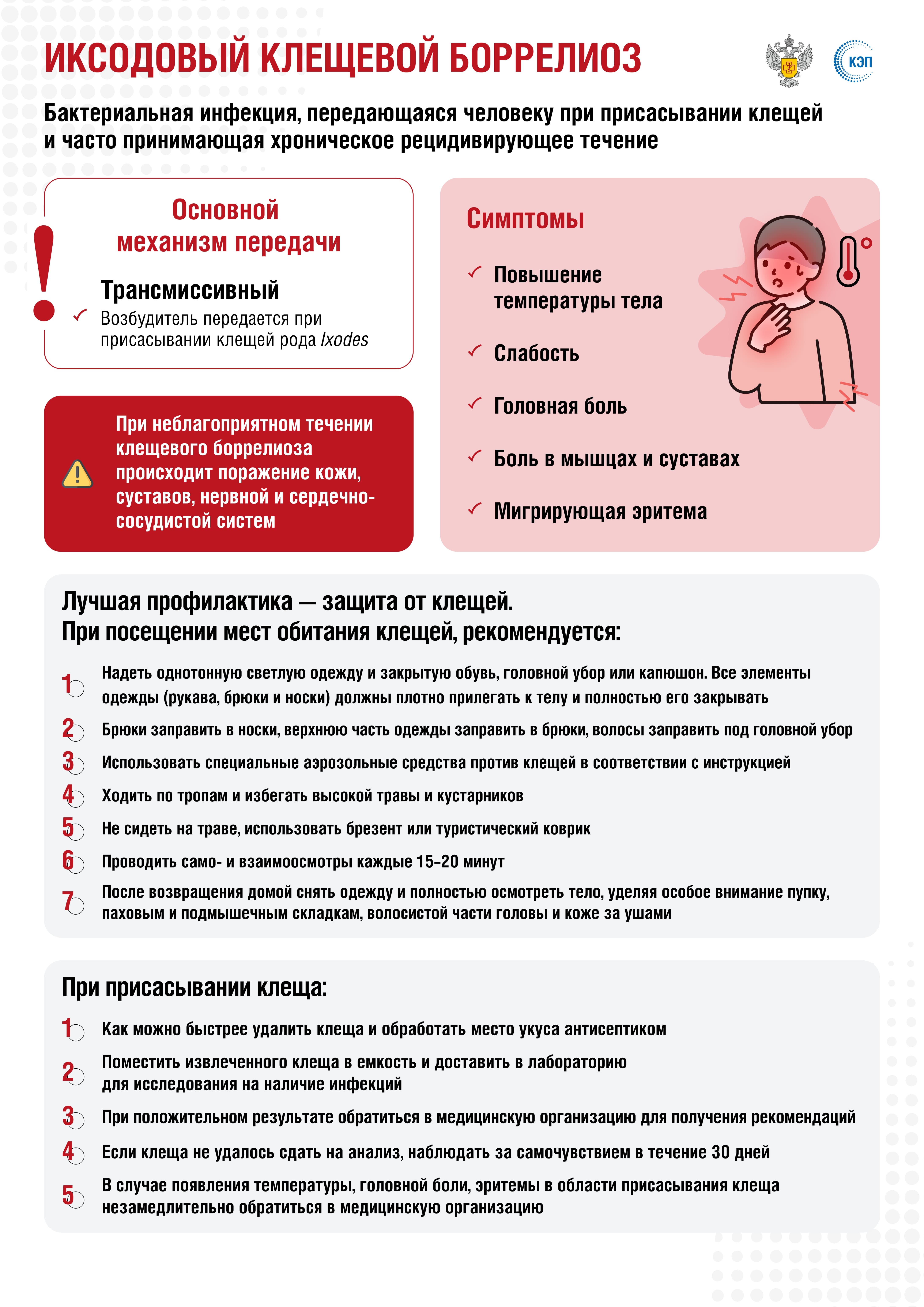 при появлении температуры, головной боли, эритемы в области присасывания клеща незамедлительно обратиться в медицинскую организацию.
