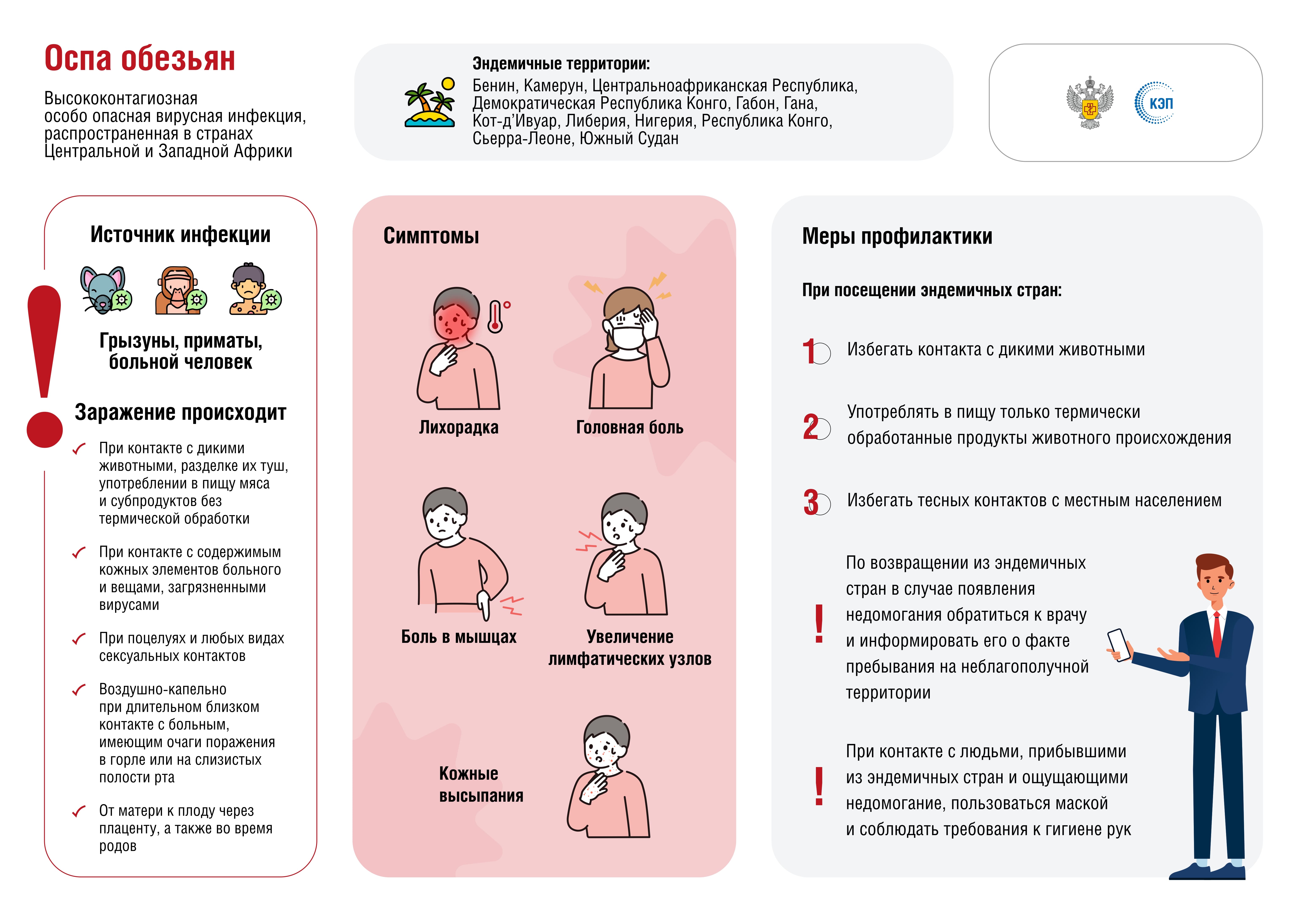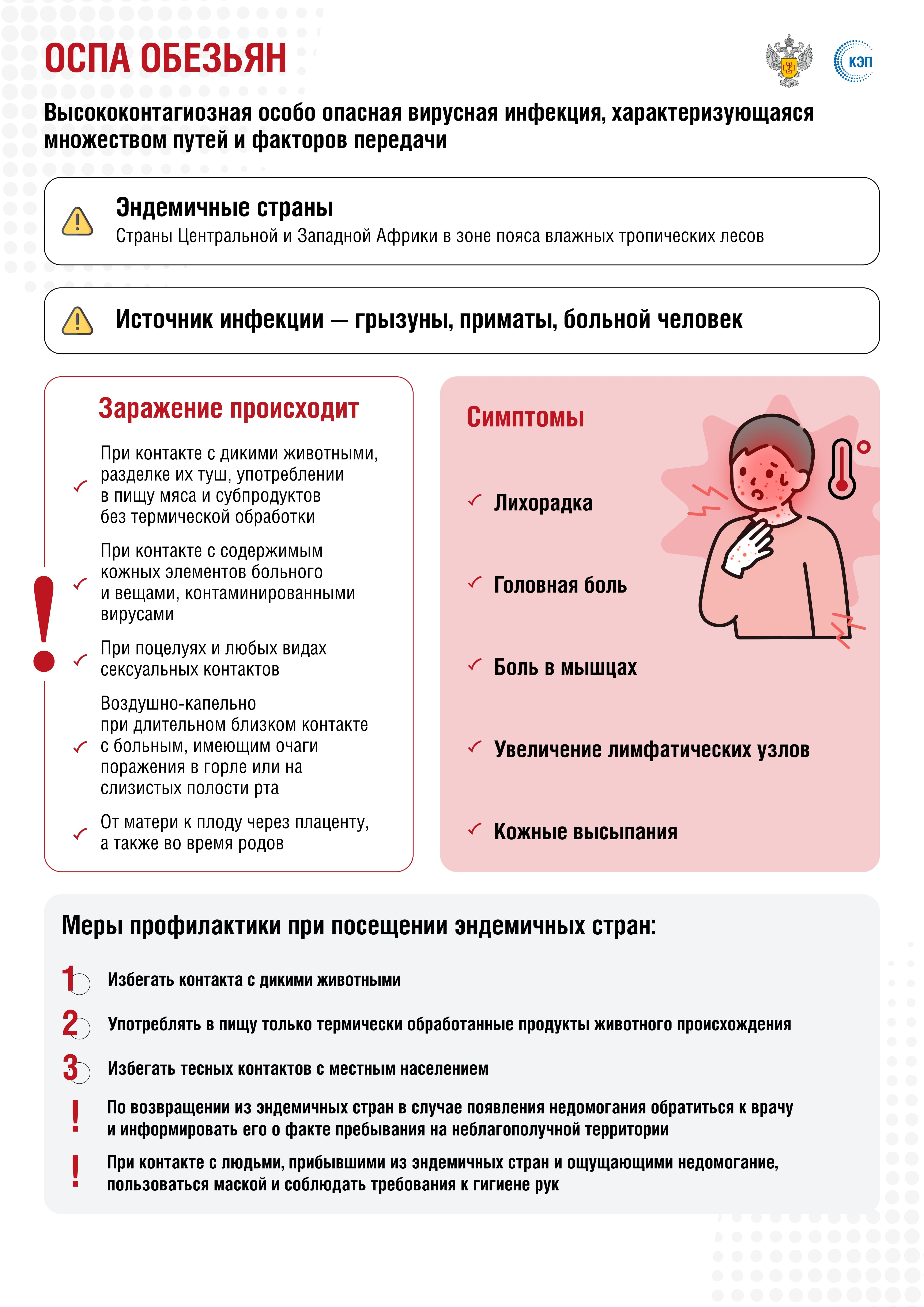 Несмотря на то что Российская Федерация не является эндемичной территорией, в связи с развитием массового туризма, интенсификацией миграционных процессов, деловых и торговых связей не исключен завоз оспы обезьян на территорию нашей страны.
