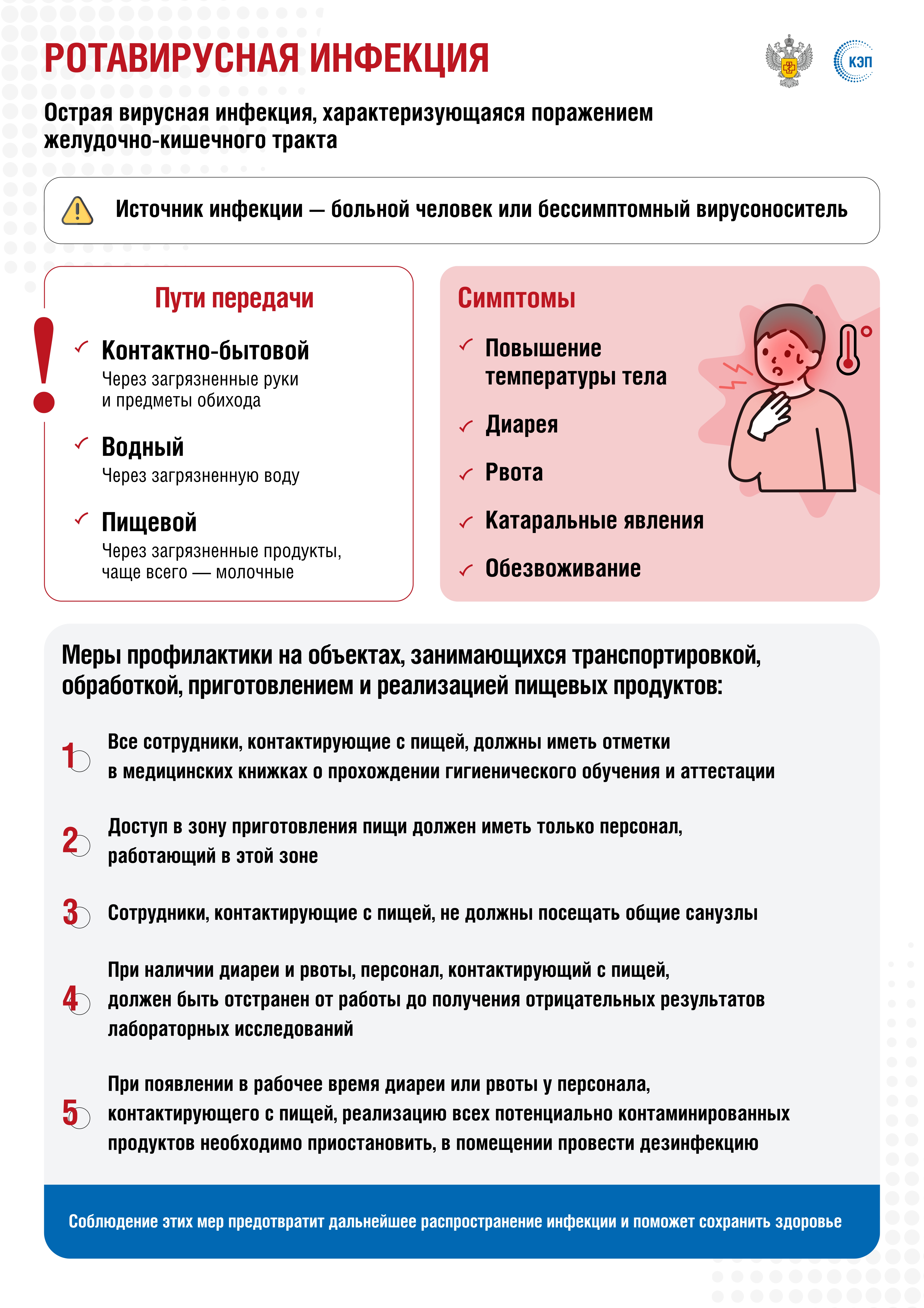 - при наличии диареи и рвоты, персонал, контактирующий с пищей, должен отстраняться от работы до получения отрицательных результатов лабораторных исследований на наличие ротавирусов;